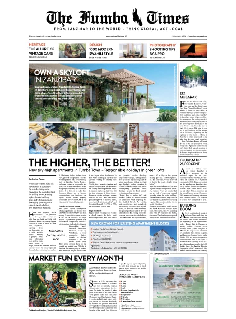 New sky-high apartments in Fumba Town – Responsible holidays in green lofts By Andrea Tapper Where can you still build sea view houses in Zanzibar? On top of existing ones! Quenching the insatiable thirst for holiday homes, meeting higher-density building goals and yet maintaining a thoroughly green approach – that is the idea behind new